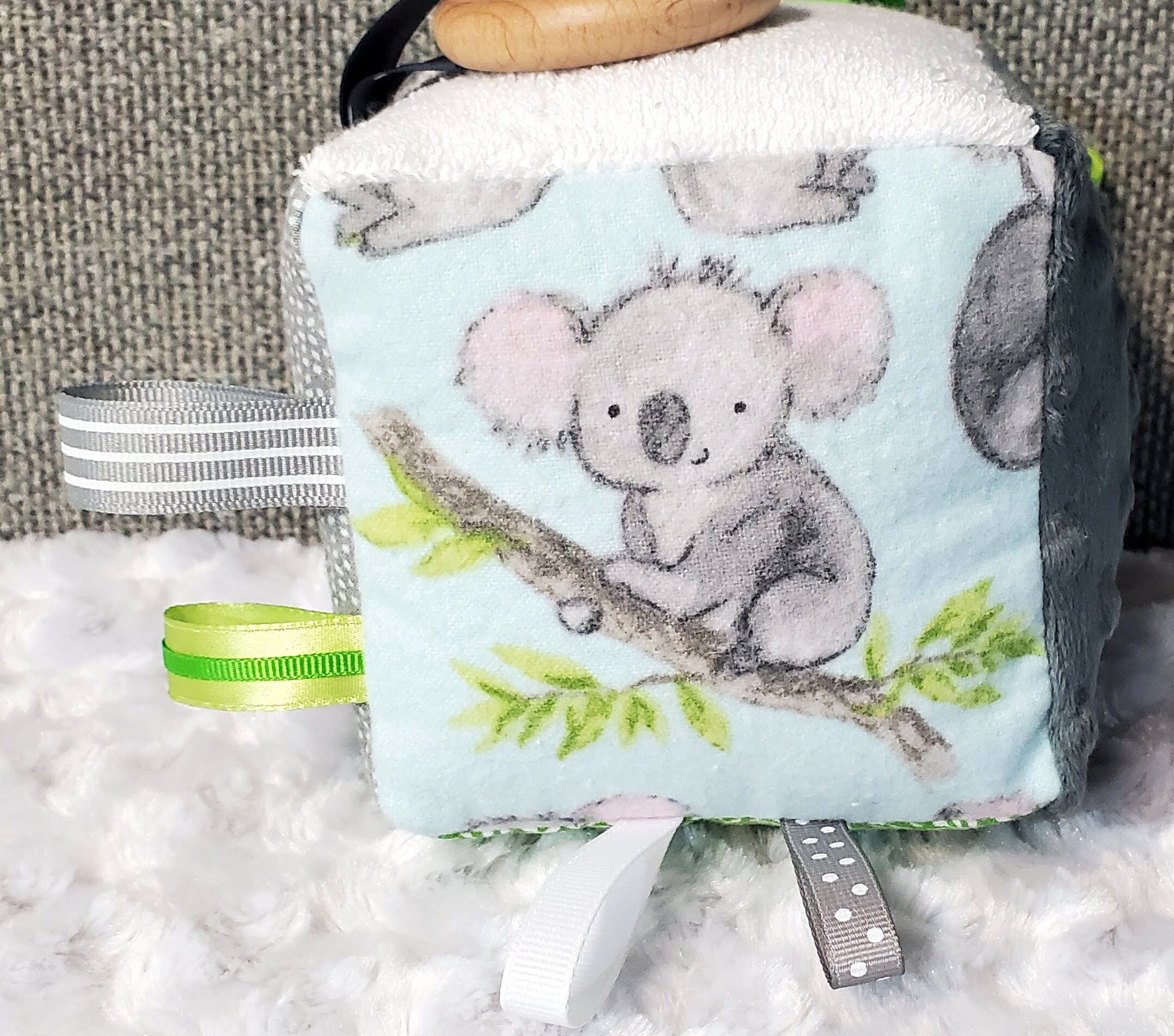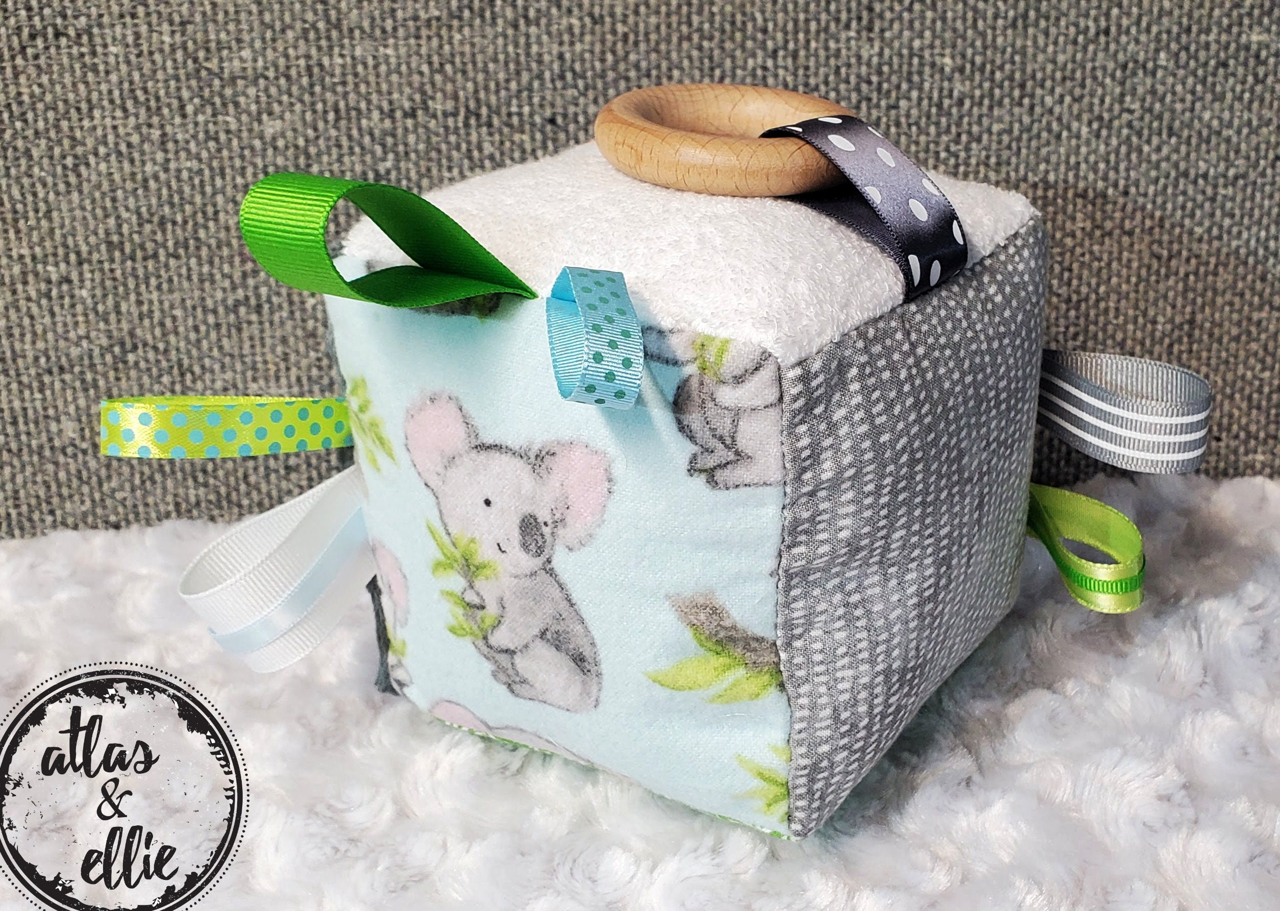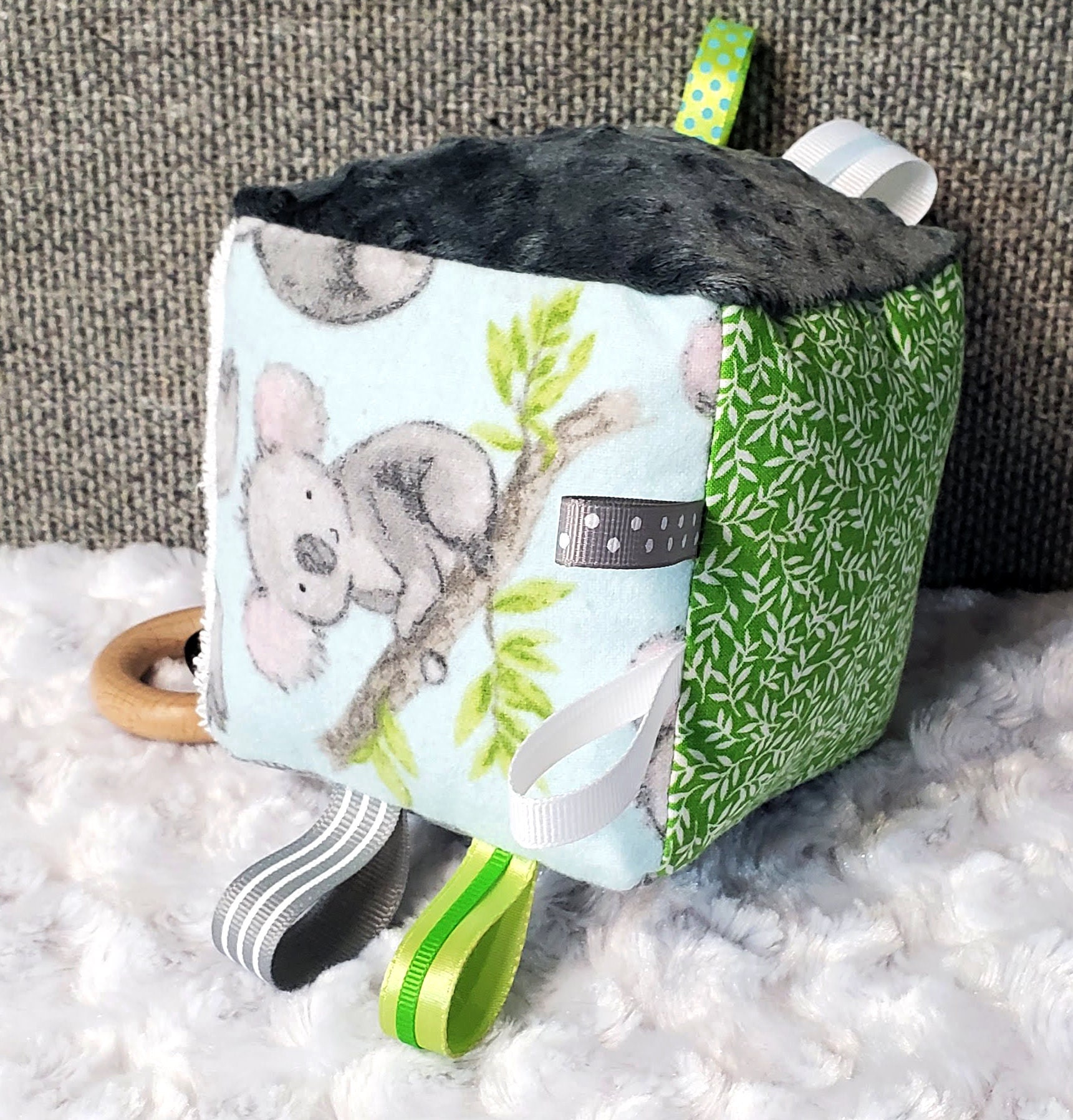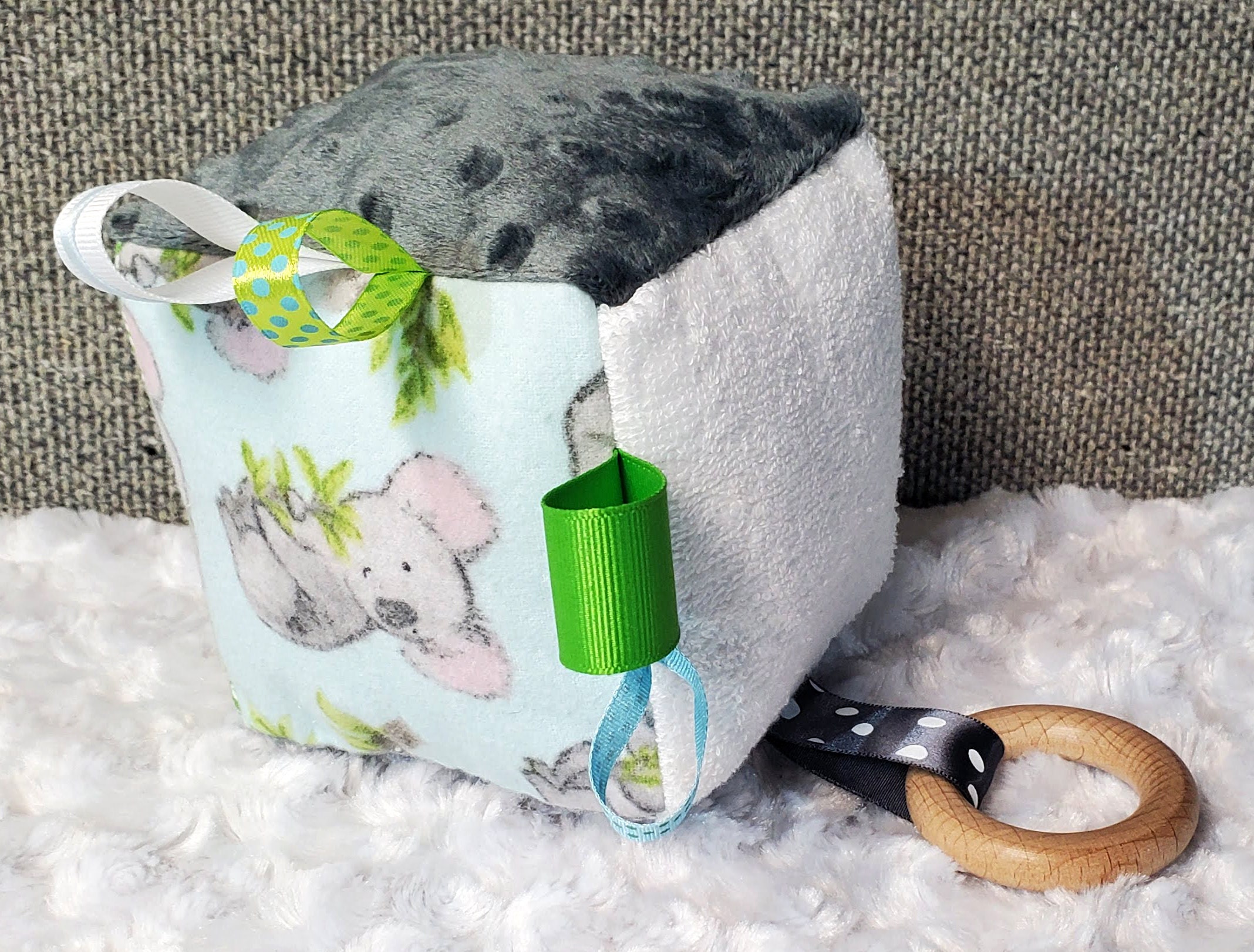 - different textures and prints to enhance your baby's senses - a wooden teething ring looped through a ribbon - different colored ribbons to grab a hold of -crinkle paper on one side
