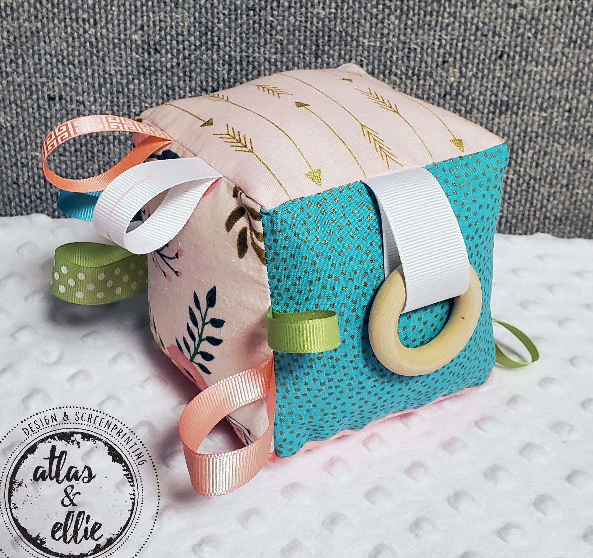 This sensory cloth block is designed for babies. Each side has textures and prints to enhance your baby's senses, including: a wooden teething ring looped through a ribbon and different colored and textured ribbons to grab a hold of.