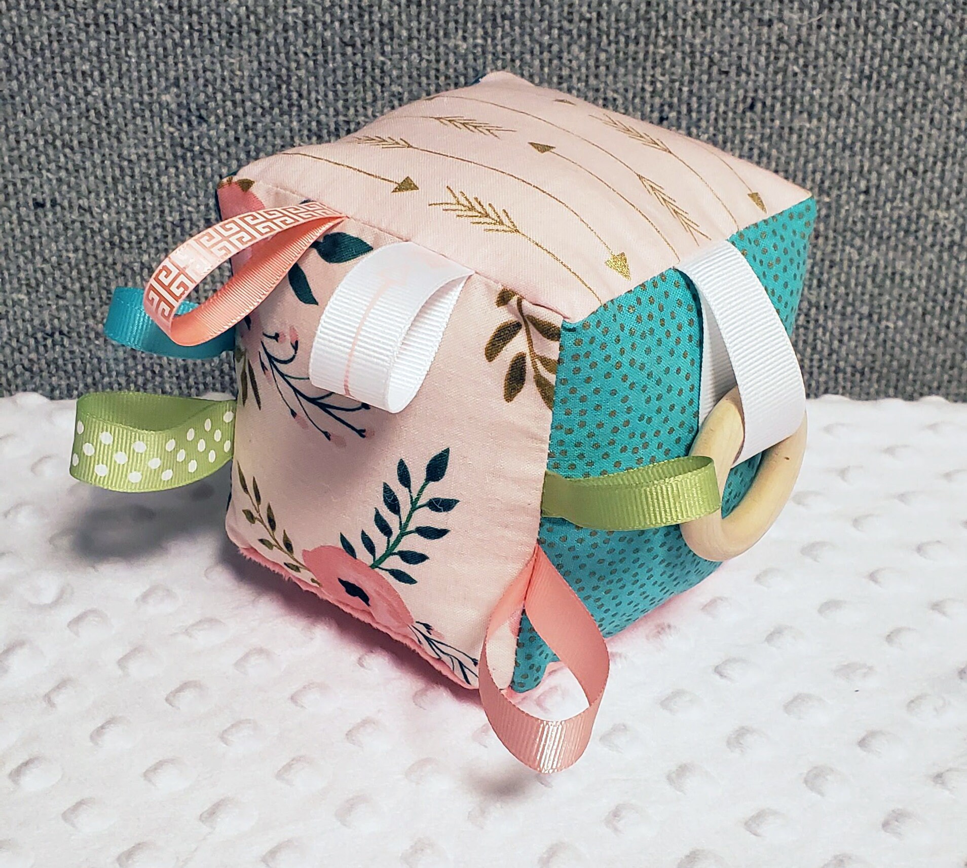 This block is approximately 4 inches square and is made out of cotton, soft minky and flannel fabrics.