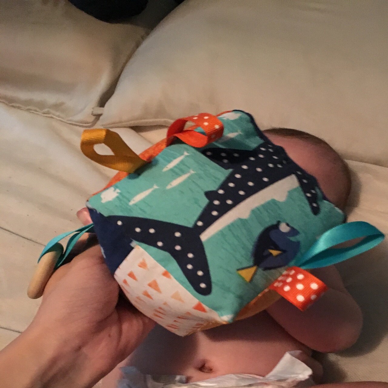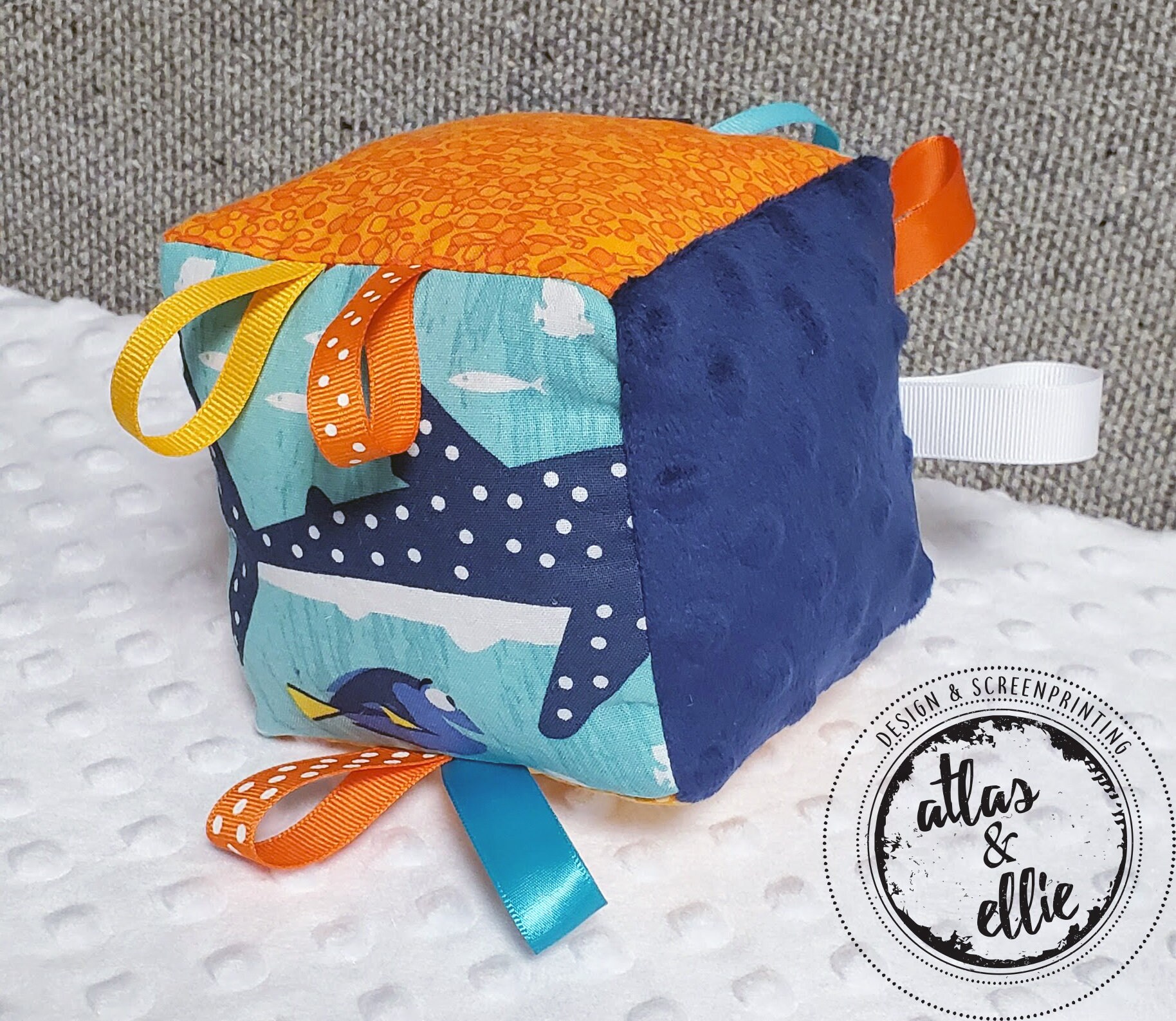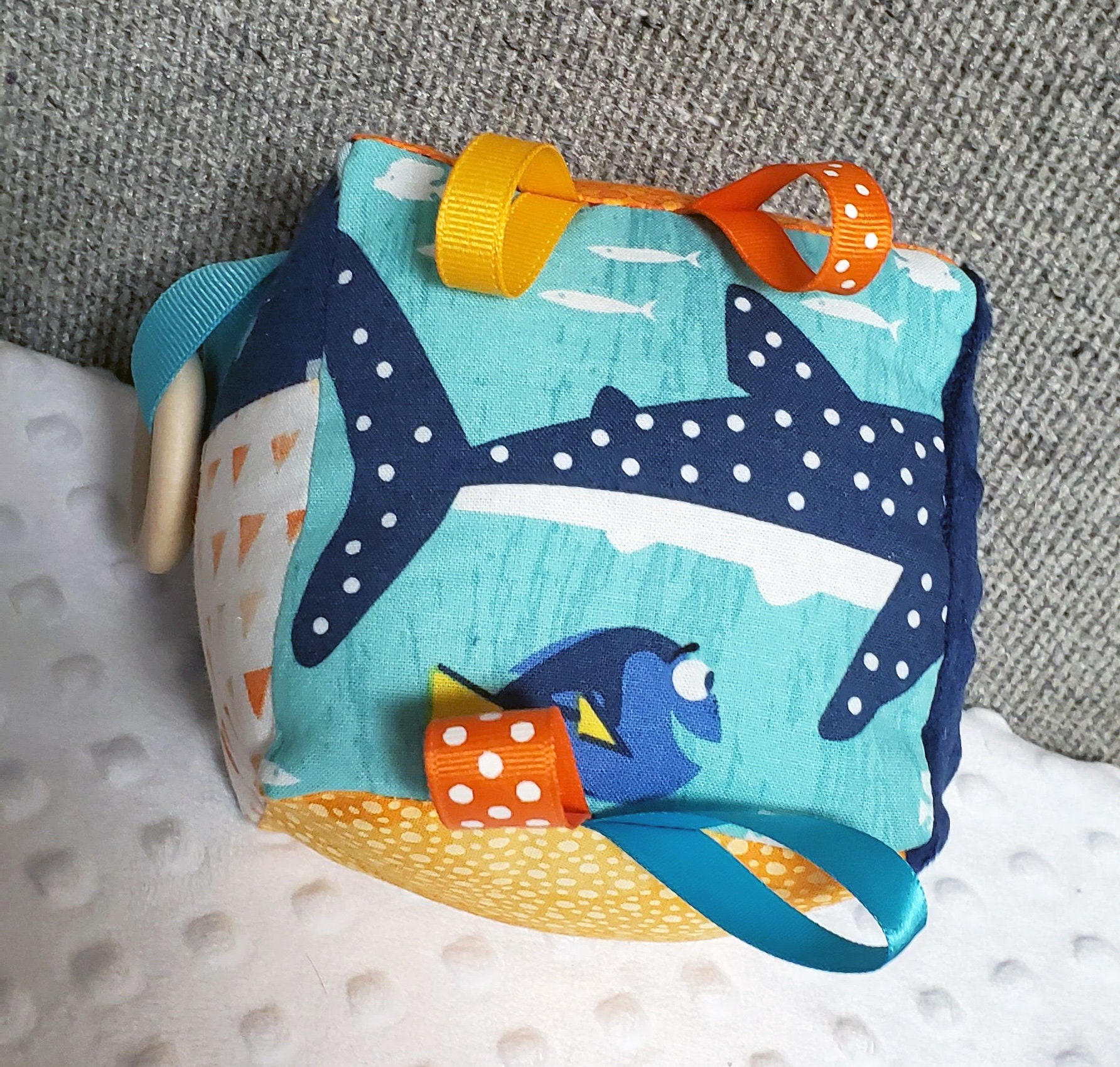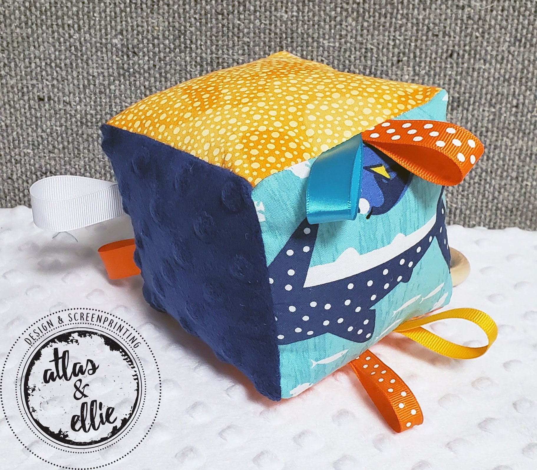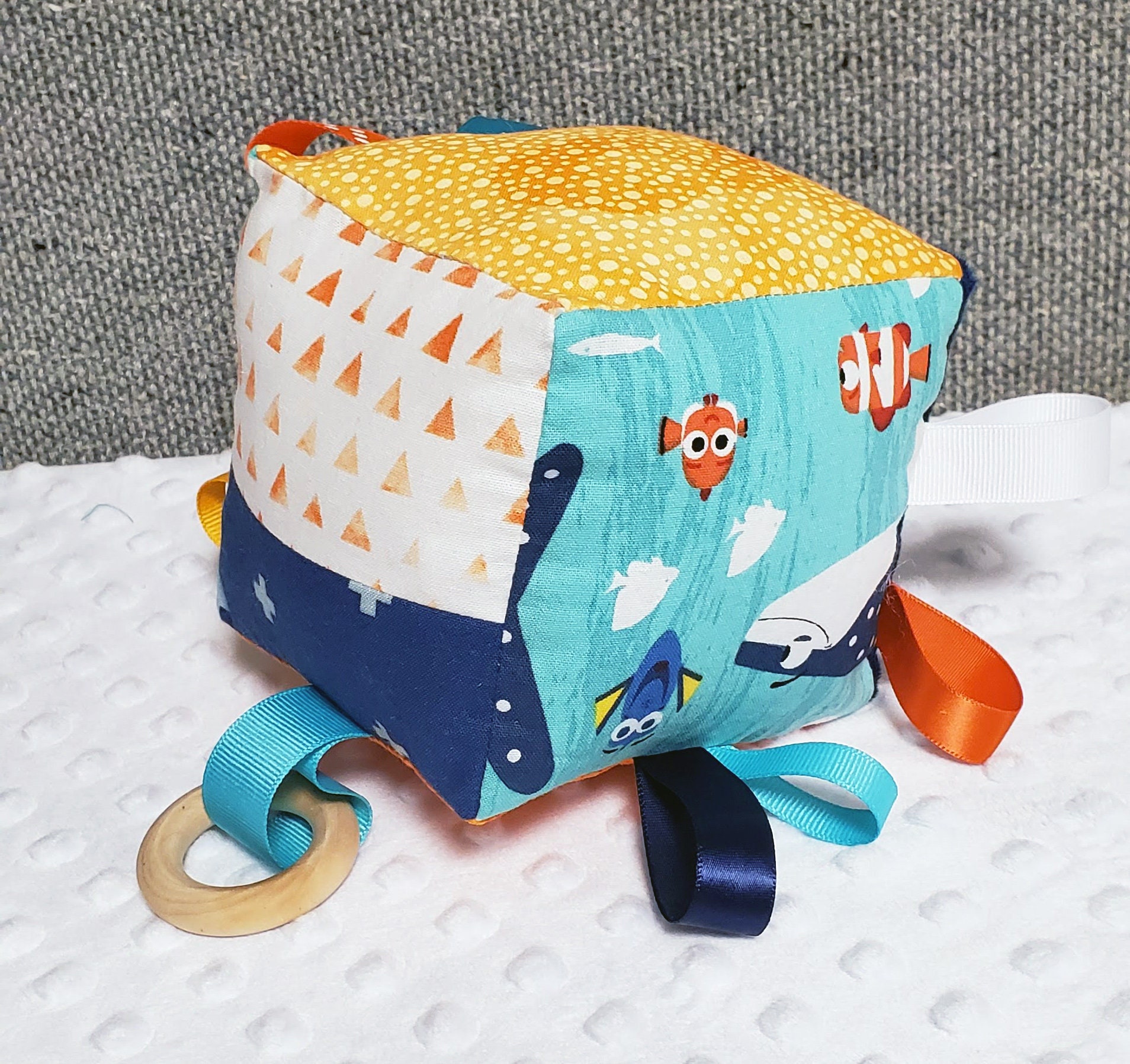 This sensory cloth block is designed for babies. Each side has textures and prints to enhance your baby's senses, including: a wooden teething ring looped through a ribbon and different colored and textured ribbons to grab a hold of.