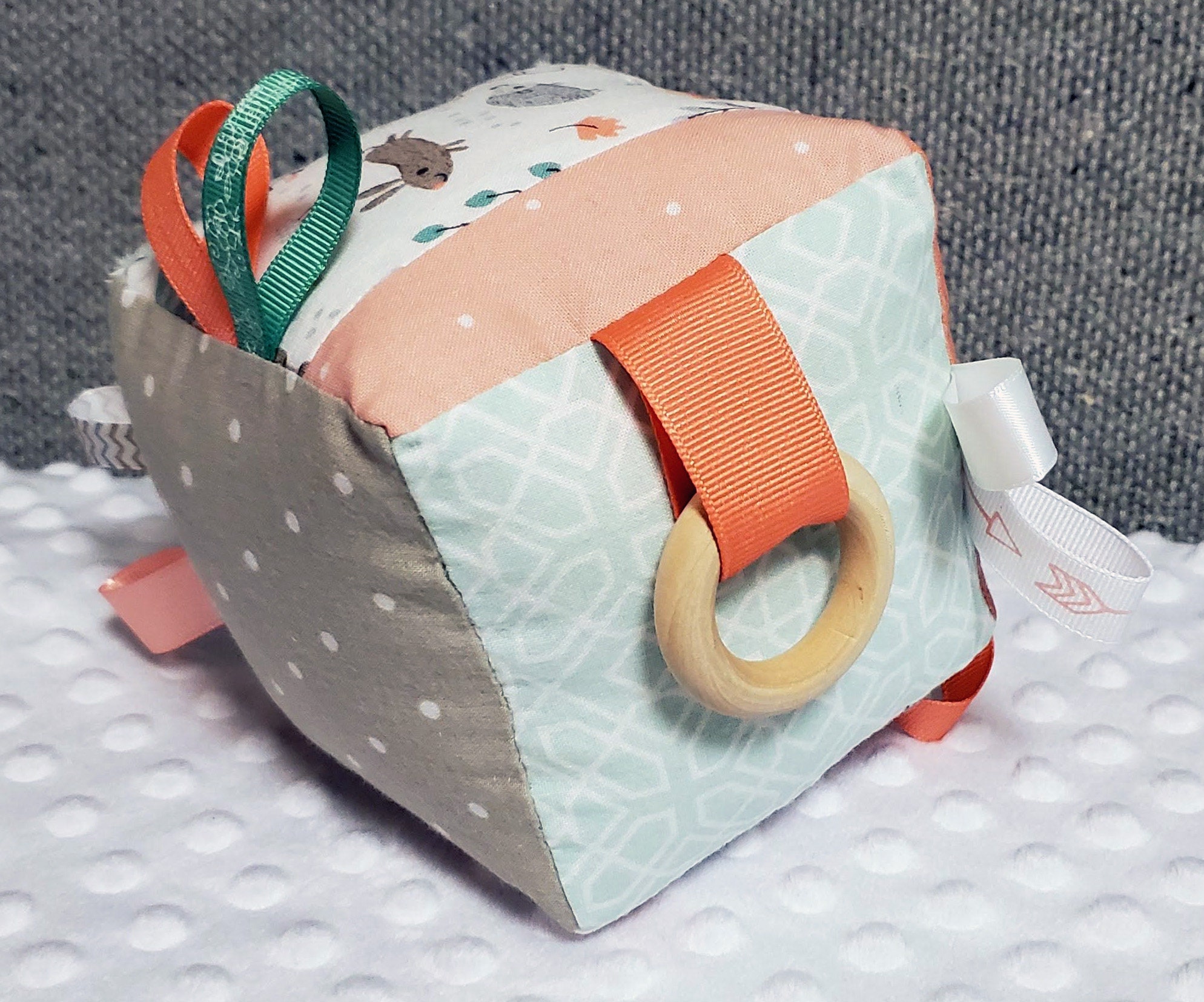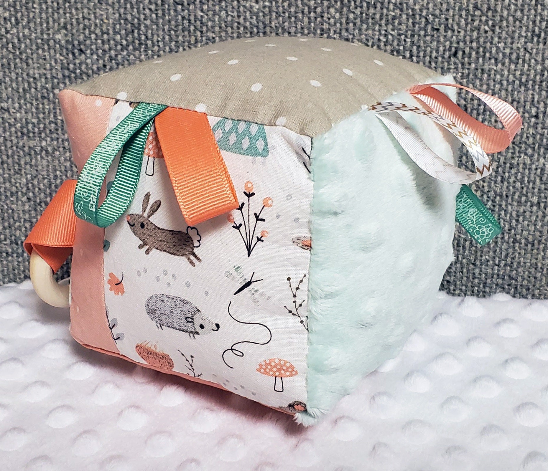 This block is approximately 4 inches square and is made out of cotton, soft minky and flannel fabrics.
