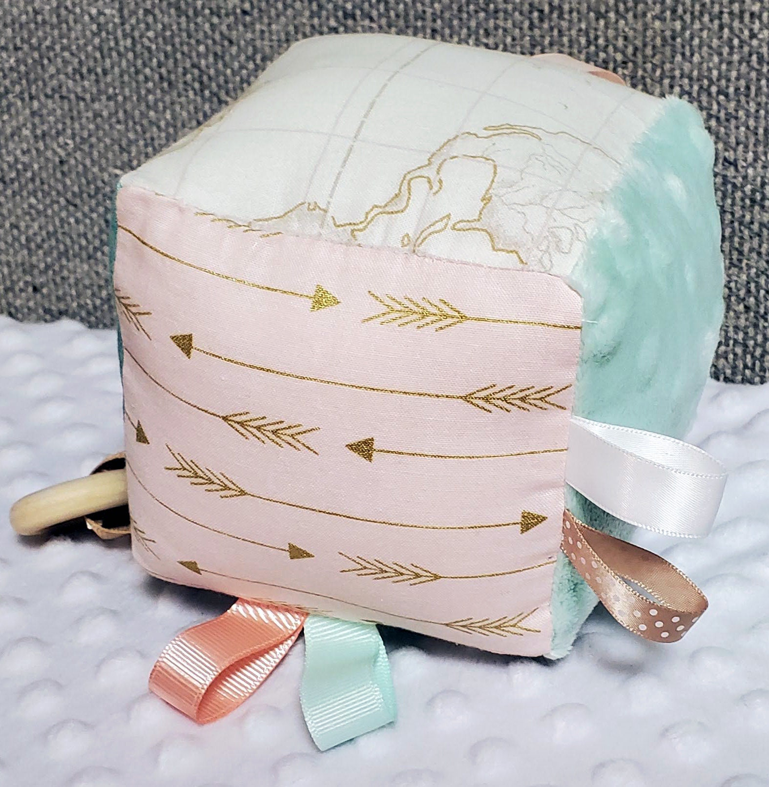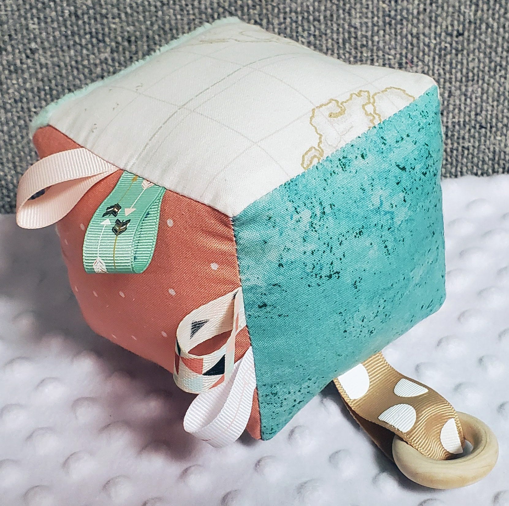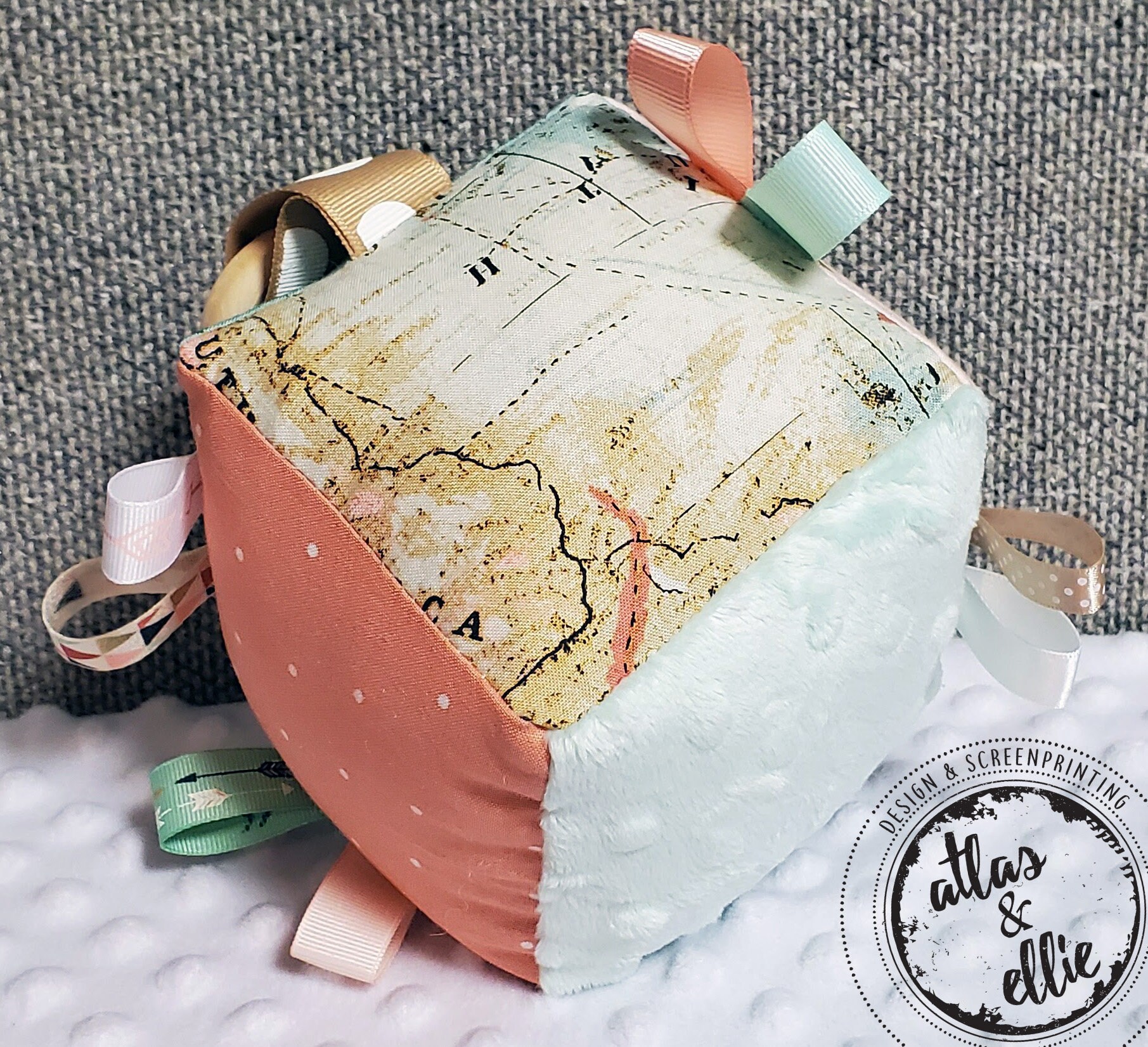Soft baby block, Sensory baby toy, teething toy, sensory block, baby fabric block, adventure, explore, travel, maps, peach and teal, arrows