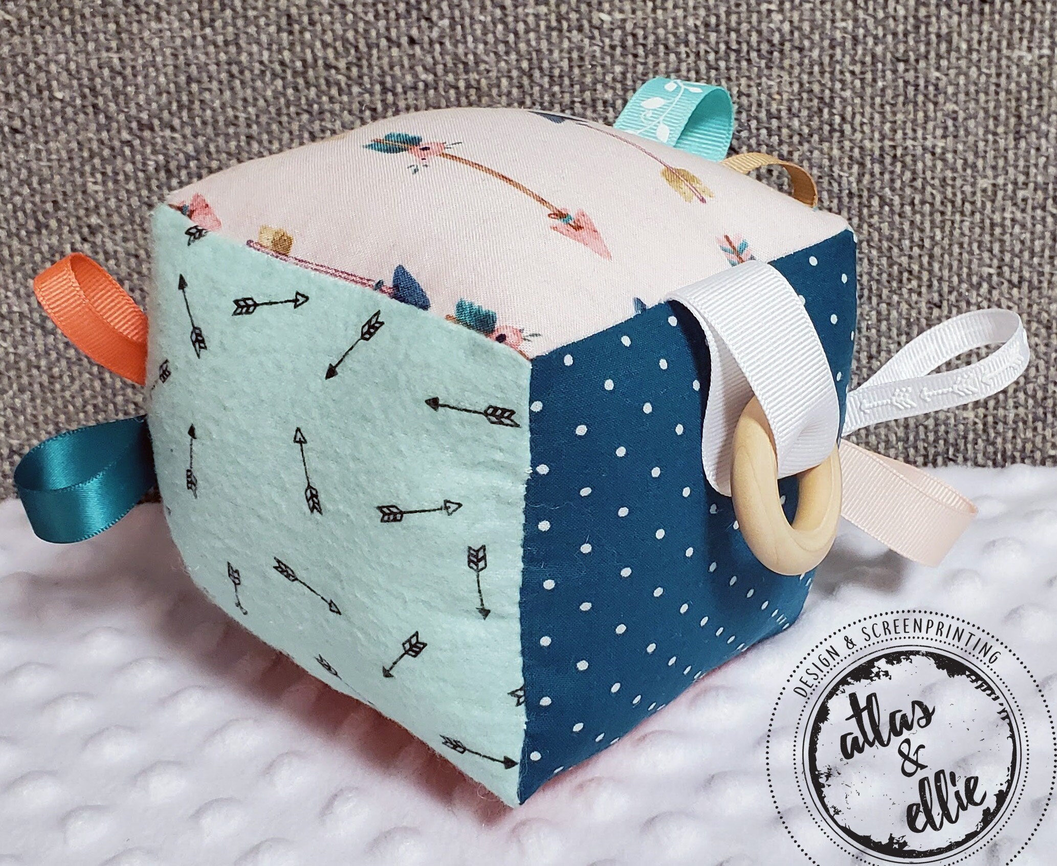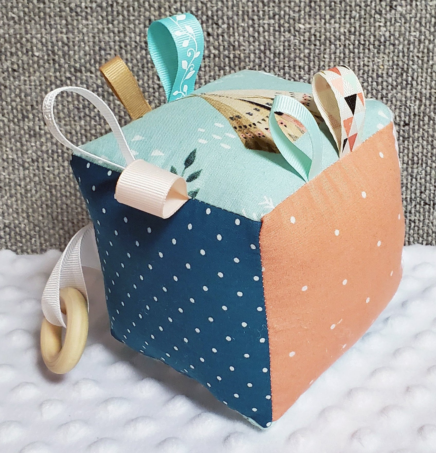 This sensory cloth block is designed for babies. Each side has textures and prints to enhance your baby's senses, including: a wooden teething ring looped through a ribbon and different colored and textured ribbons to grab a hold of.