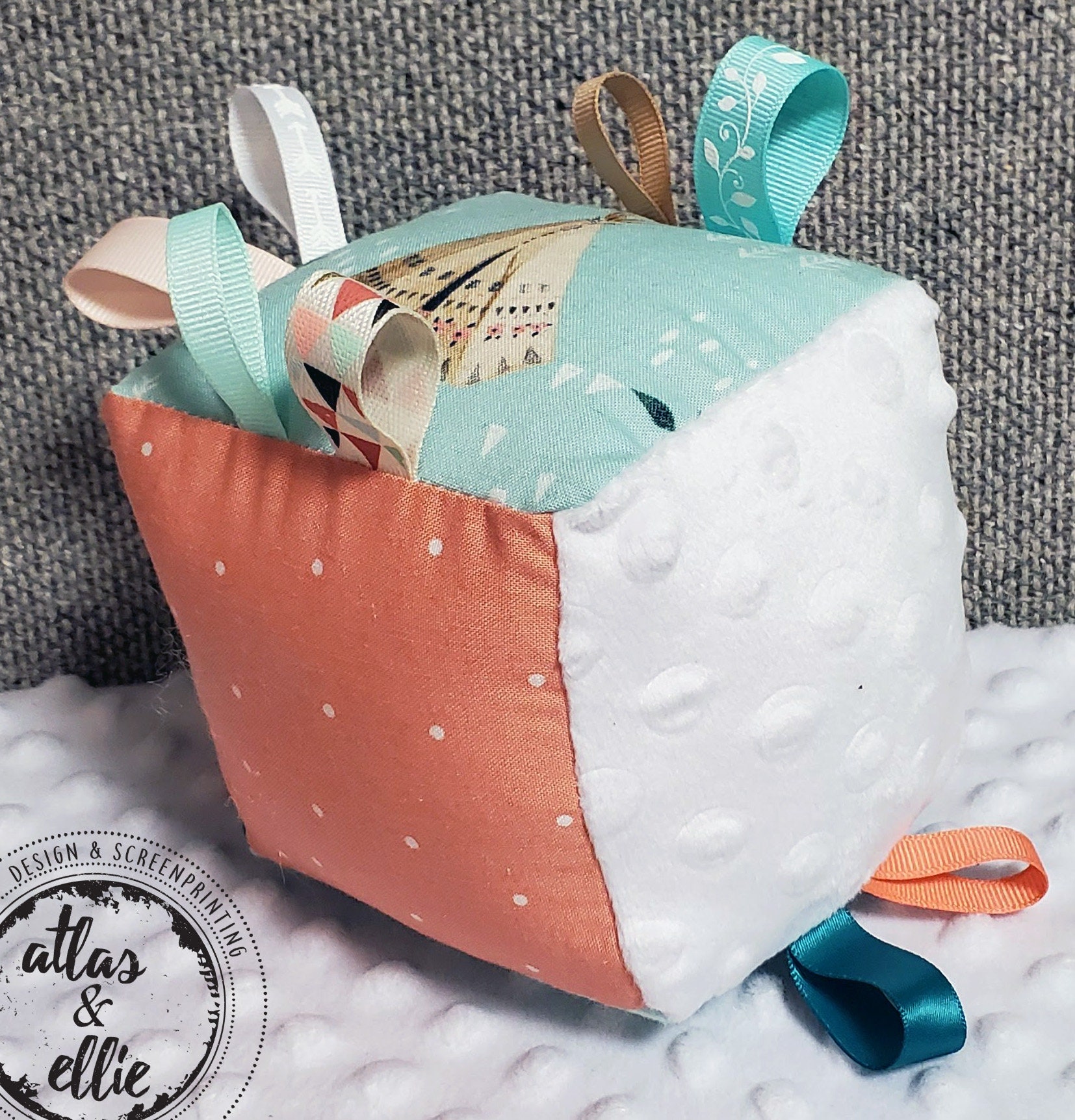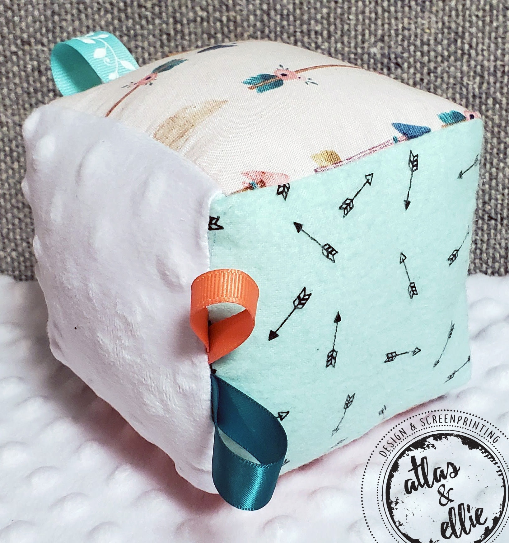 This block is approximately 4 inches square and is made out of cotton, soft minky and flannel fabrics.