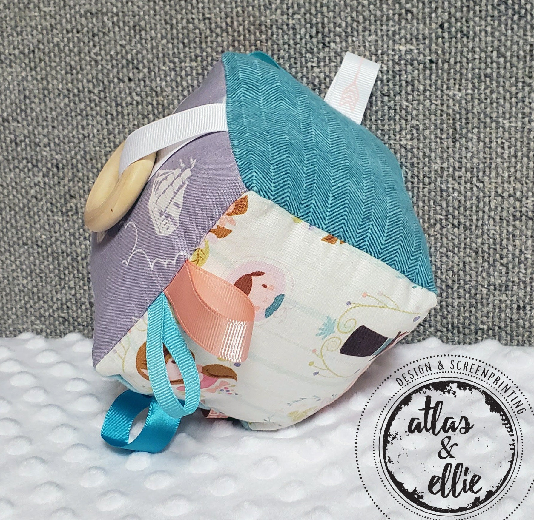 This sensory cloth block is designed for babies. Each side has textures and prints to enhance your baby's senses, including: a wooden teething ring looped through a ribbon and different colored and textured ribbons to grab a hold of.